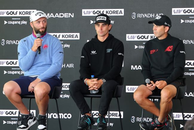 LIV Golf players competing at LIV Golf Korea attend a pretournament press conference at Jack Nicklaus Golf Club Korea in Incheon, just west of Seoul, on April 30, 2025. From left: Jon Rahm of Spain, Joaquin Niemann of Chile and Sergio Garcia of Spain. (Image courtesy of Yonhap)