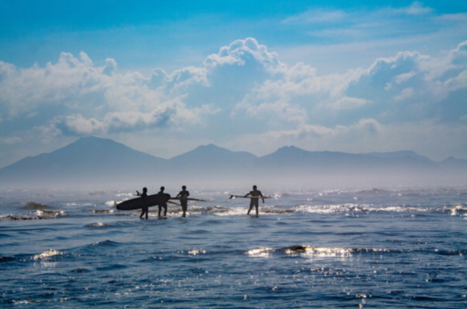 Surfers are walking along the beach with their surfboards at Dadaepo Beach in Saha-gu, Busan. Dadaepo Beach is known as a paradise for summer sports, with its gentle waters and wide sandy shores.