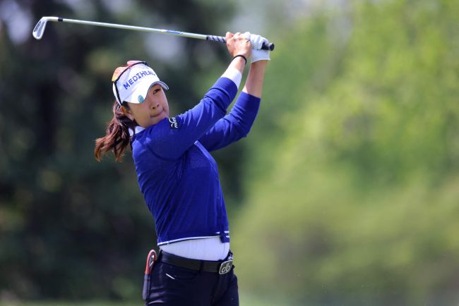 Kim A-lim of South Korea tees off on the fourth hole during the first round of the Mizuho Americas Open at Liberty National Golf Club in Jersey City, New Jersey, on May 8, 2025, in this Getty Images photo. (Yonhap)