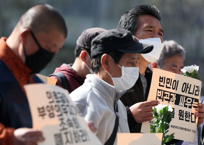 Civil society organizations calling for the abolition of the family support obligation criteria under the National Basic Livelihood Security System. (Image courtesy of Yonhap)