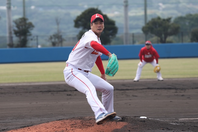 Kim Kwang-hyun of the SSG Landers delivers a pitch during spring training at Uruma City Gushikawa Baseball Stadium in Uruma, Japan, in this Feb. 24, 2025, file photo provided by the Landers. (Image courtesy of Yonhap)