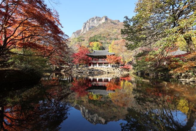 Nestled in Jangseong County, South Jeolla Province, Baegyangsa is known for its “baby maple” trees and the twin-pavilion bridge of Ssanggyeru, whose reflection on the temple pond creates a scene that has long drawn photographers at sunrise.