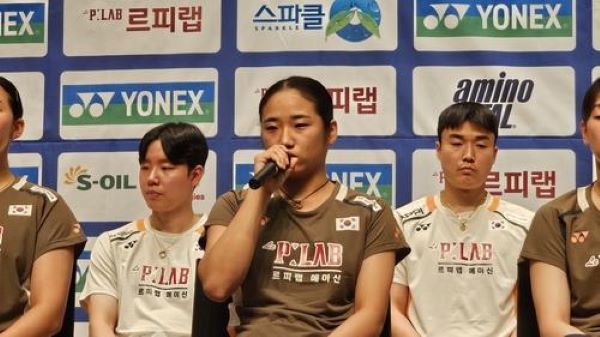 South Korean badminton player An Se-young speaks during the national team press conference at the Jincheon National Training Center in Jincheon, North Chungcheong Province, on Aug. 18, 2025. (Image courtesy of Yonhap)