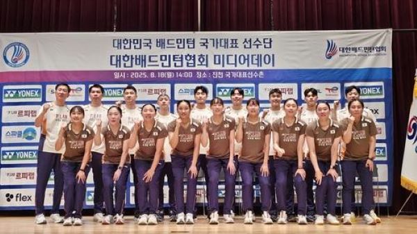 Players and coaches for the South Korean national badminton team pose for photos after their joint press conference at the Jincheon National Training Center in Jincheon, North Chungcheong Province, on Aug. 18, 2025. (Image courtesy of Yonhap)