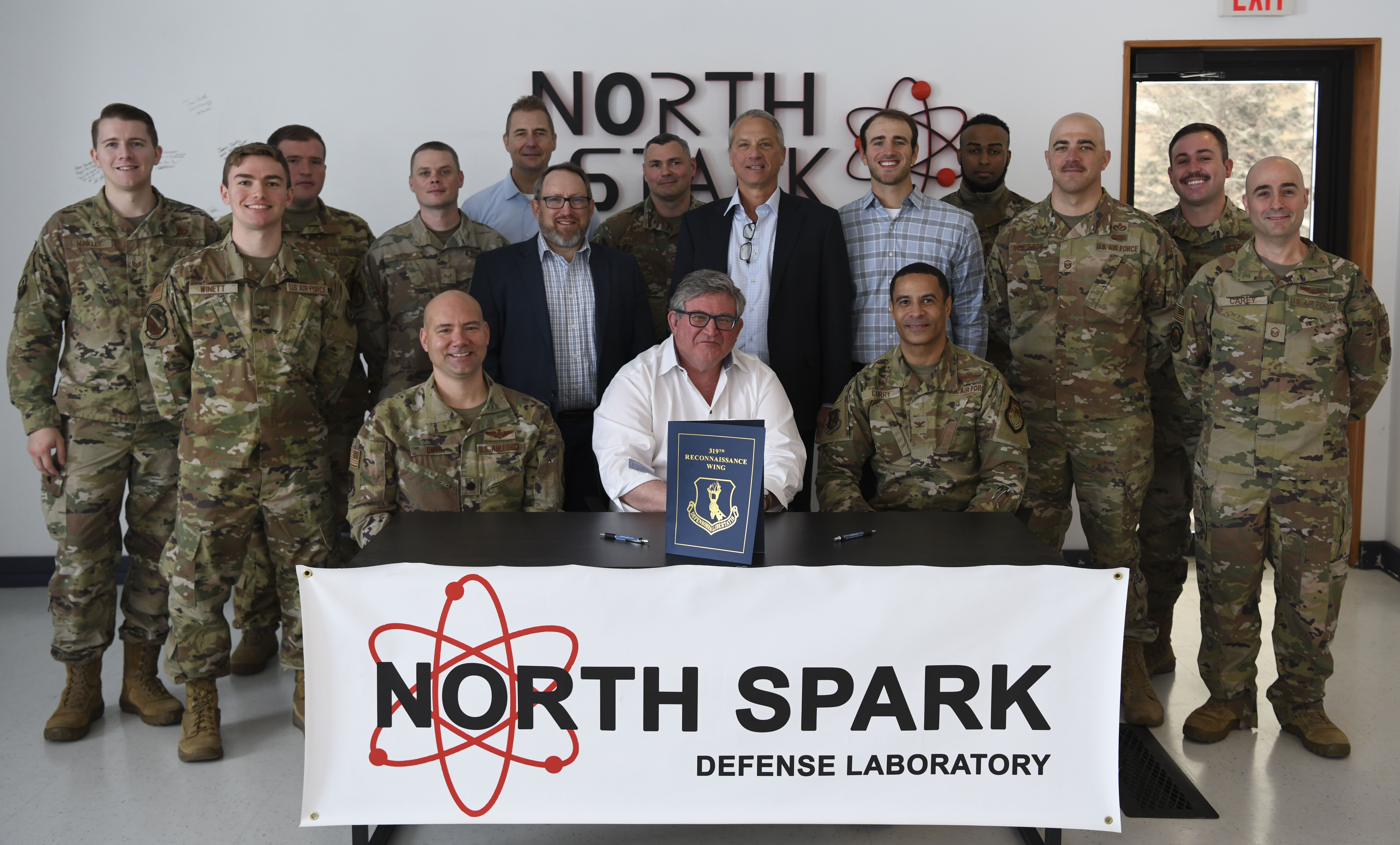 U.S. Air Force Col. Timothy Curry, 319th Reconnaissance Wing commander, the Bakken Energy Team, and the North Spark Defense Laboratory team pose for a photo Nov. 15, 2022, at the North Spark Defense Laboratory on grand Forks Air Force Base, North Dakota. Curry signed an agreement partnering with Bakken Energy to allow Grand Forks AFB to implement alternative energy solutions. (U.S. Air Force photo by Senior Airman Roxanne Belovarac)