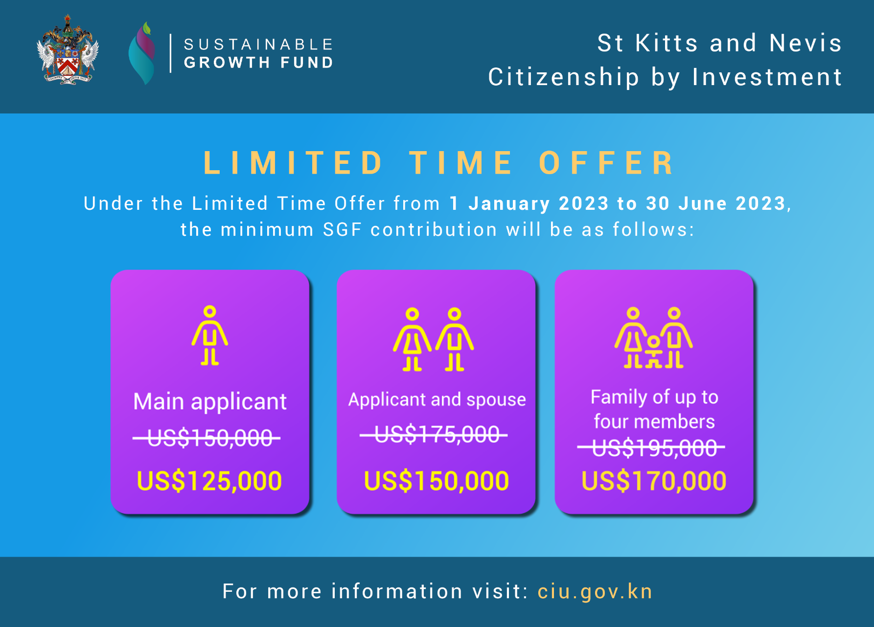 The Citizenship by Investment Unit launched a Limited Time Offer under the Sustainable Growth Fund investment option that is available from 1 January 2023 until 30 June 2023. This once-in-a-lifetime opportunity offers investors the chance to contribute a reduced minimum of US$125,000 and a processing time of 60 days. From 1 July 2023, the minimum contribution will go back to US$150,000 and the processing time of 90 days for Non-Accelerated Applications, Accelerated Applications are required to pay a premium due diligence fee.