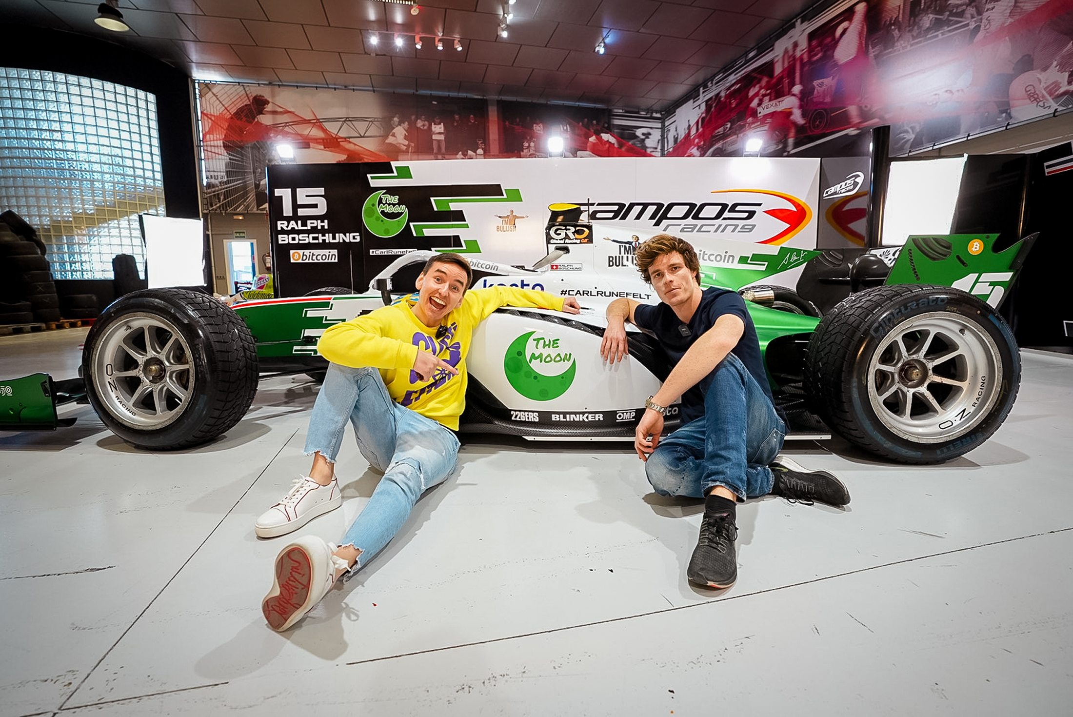 Carl Runefelt sitting together with Formula 2 driver Ralph Boschung in front of the Campos Racing car.