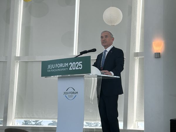 Former U.S. Ambassador to South Korea Harry Harris makes remarks during a session of the Jeju Forum for Peace and Prosperity, on Jeju Island, South Korea, on May 29, 2025. (Image courtesy of Yonhap)