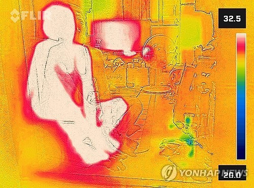 On July 24, as midday temperatures in Seoul soared to 34°C, a resident in Seoul Station’s jjokbangchon (shantytown) endures the heat in a room without air conditioning. Captured with a thermal imaging camera, the image shows hotter areas in red and cooler areas in blue. (Yonhap)