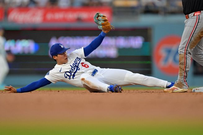 Los Angeles Dodgers second baseman Kim Hye-seong stretches for a ball during a Major League Baseball regular-season game against the Minnesota Twins at Dodger Stadium in Los Angeles on July 23, 2025, in this photo via Reuters. (Yonhap)