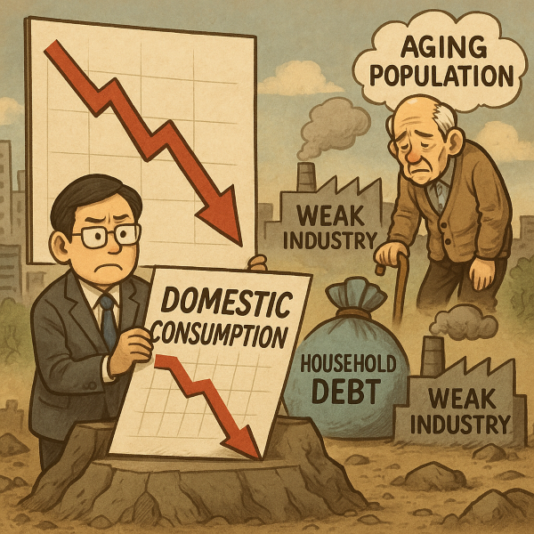 South Korea’s domestic consumption has entered a sustained decline, not due to temporary shocks like COVID-19 or inflation, but as a result of entrenched structural challenges, including a rapidly aging population, evolving labor market dynamics, and shifts in the country’s industrial landscape. (Image created by AI/ChatGPT)