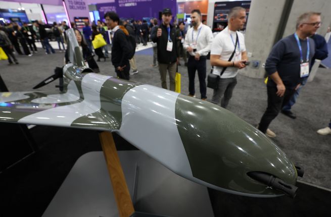 On the opening day of CES on Jan. 6 (local time), a combat drone is on display at the ESOX Group booth at the Las Vegas Convention Center (LVCC) in Nevada, United States. (Yonhap)