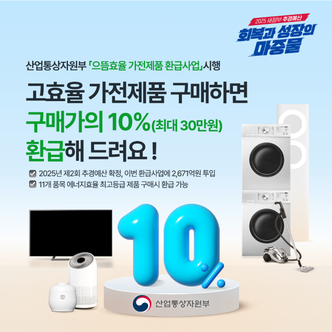 SEOUL, Aug. 13 (Korea Bizwire) – South Korea’s Ministry of Trade, Industry and Energy (MOTIE) has announced a new rebate program offering consumers a 10% refund on energy-efficient household appliances purchased after July 4, 2025.
