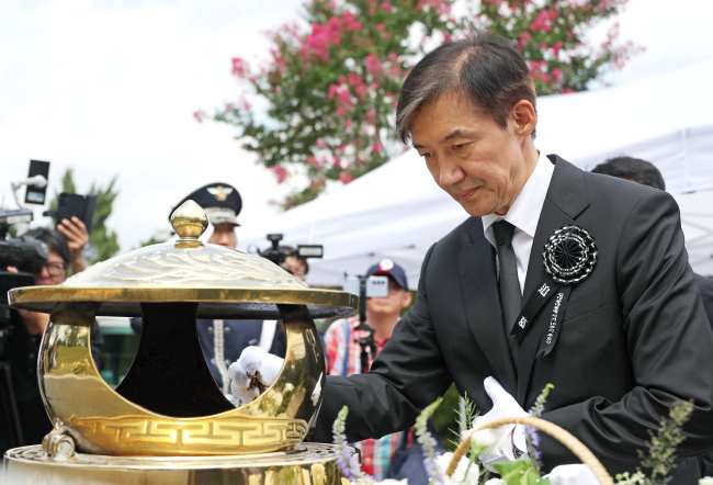 Cho Kuk, former leader of the minor Rebuilding Korea Party, burns incense to pay tribute to late President Kim Dae-jung in front of Kim’s tomb during a memorial service to mark the 16th anniversary of his death at the National Cemetery in Seoul on Aug. 18, 2025. (Image courtesy of Yonhap)