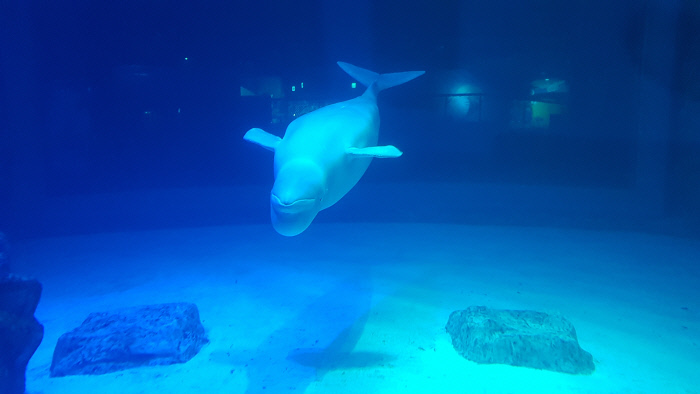 Beluga whale “Bella,” who remains confined in a tank at Lotte World Aquarium. In addition to Bella, there were originally two other belugas, “Bello” and “Belly.” Bello died of septicemia in April 2016, and Belly died of the same condition in October 2019. Their deteriorating health was attributed to tinnitus-like symptoms and depression.
