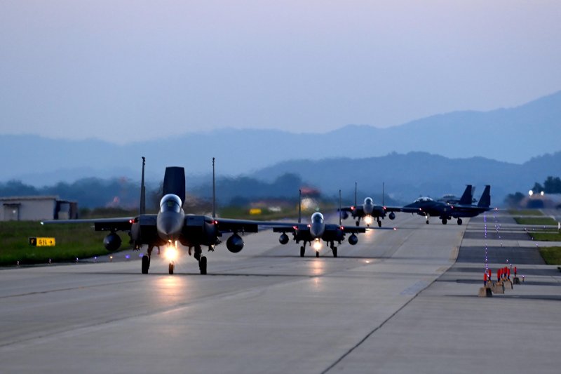 A formation of F-15K fighter jets taxiing on the ground for a night sortie. (Photo courtesy of the Republic of Korea Air Force)