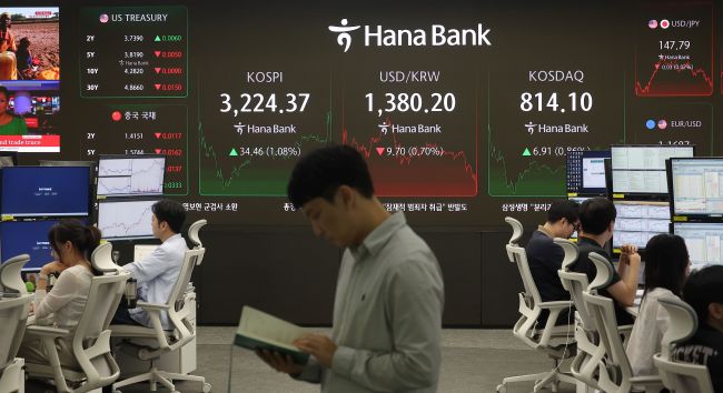 Traders at Hana Bank’s main dealing room in Seoul monitor market movements and execute trades. (Image courtesy of Yonhap)