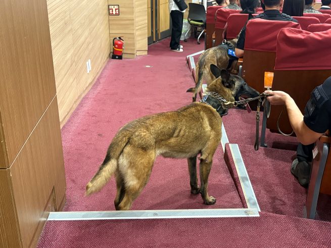 Police dog Rui stands in a dignified pose at the National Assembly Policy Forum on “Establishing a Legal Basis for Supporting Service Animals,” held on September 23 in the main conference hall of the National Assembly Members’ Office Building. (Yonhap)