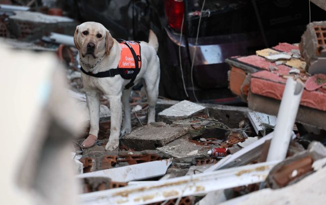 On February 10, 2023, in Antakya, Hatay, Türkiye, a rescue dog named “Tobeki,” injured during search operations, continues working with a bandaged paw. (Yonhap)