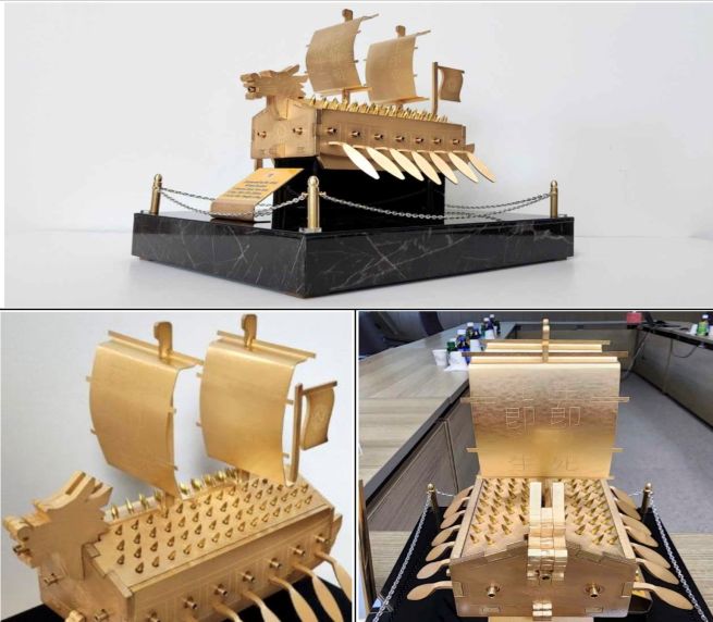A golden turtle ship, a type of Korean traditional warship, is seen in this photo provided by the presidential office. President Lee Jae Myung presented it as a gift to U.S. President Donald Trump following their summit at the White House in Washington on Aug. 25, 2025 (local time). (Yonhap)