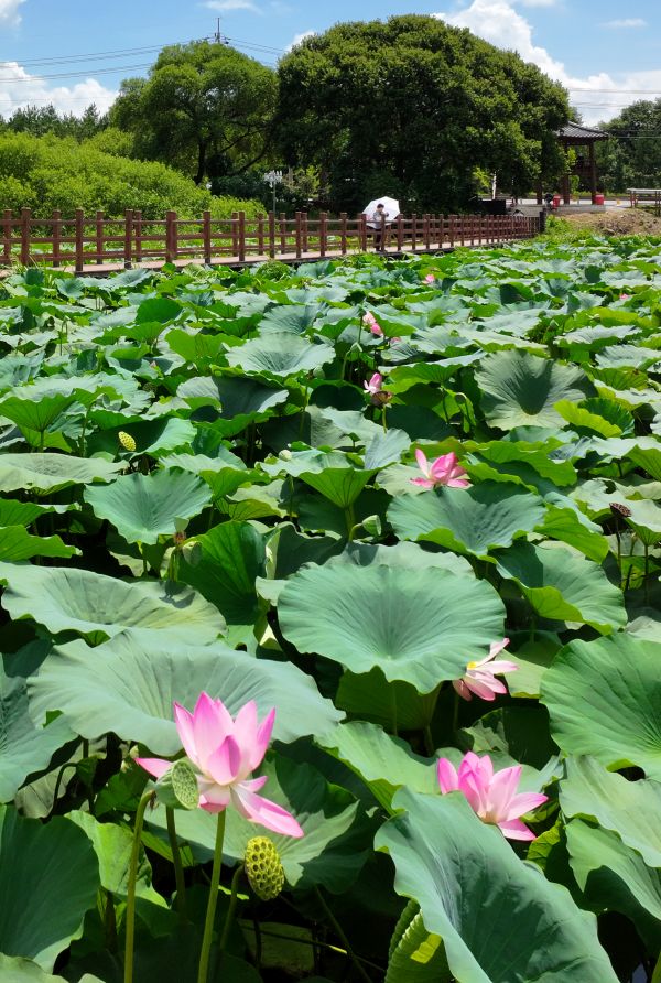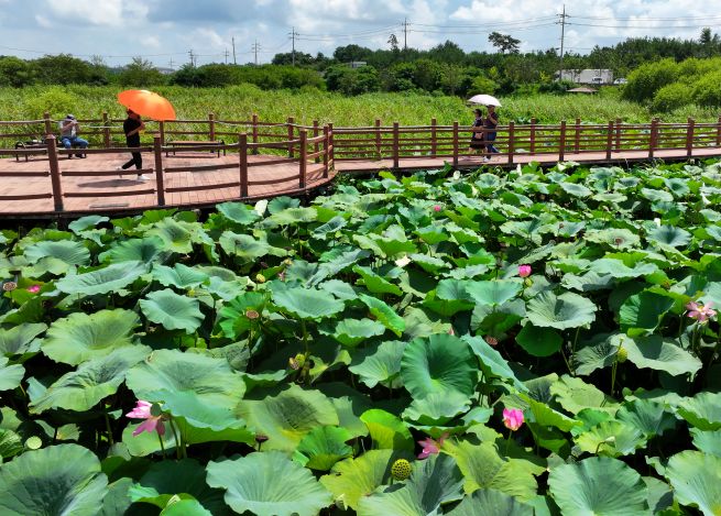 Citizens take a walk while enjoying lotus flowers at Useupje in Gongsan-myeon, Naju, South Jeolla Province.