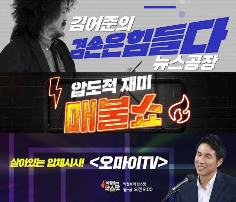 Leading progressive-leaning YouTube channels that have drawn large audiences — Kim Eo-jun’s “Humble Is Hard News Factory,” “Maebul Show,” and “OhmyTV” (Image source: screenshots from each channel)
