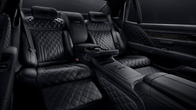 Inside, the G90 Long Wheelbase Black continues its monochromatic theme, applying black finishes to key touchpoints such as buttons, switches, steering wheel, paddle shifters, door steps, and decorative garnishes. A touch of contrast is introduced through gold accents on the Black Ash Wood trim of the cockpit and door panels.