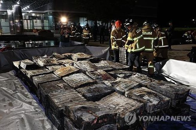 Firefighters submerge lithium-ion batteries in water while extinguishing a fire at the National Information Resources Service in Daejeon, some 140 kilometers southeast of Seoul, on Sept. 27, 2025. (Yonhap)