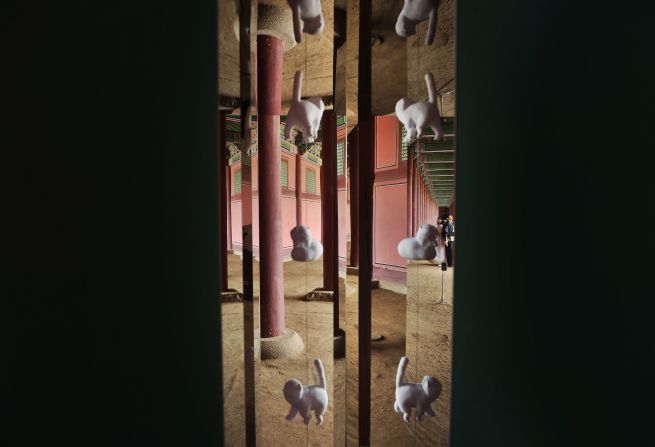 One installation, called “Dongsimwon,” invites guests to lie back and take in a mirrored view of Gyeonghoeru Pavilion, accompanied by playful sculptures such as a smiling white tiger inspired by motifs from the Joseon Dynasty.