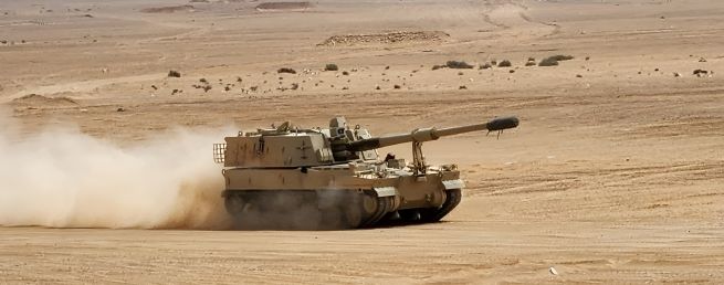 A K9 self-propelled howitzer operating in the Middle Eastern desert. (Photo provided by Hanwha Aerospace)