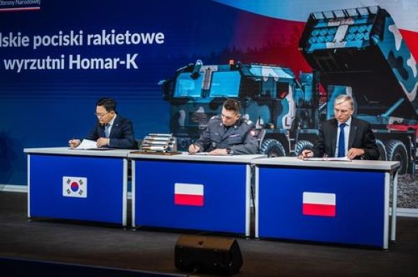 This photo, taken on Dec. 29, 2025, and provided by Hanwha Aerospace Industries Co., shows Son Jae-il (from L), president and CEO of the South Korean defense firm, Artur Kuptel, head of the Polish Armament Agency, and Piotr Wojciechowski, president of WB Group, signing a contract at the Museum of the Polish Army in Warsaw to produce Chunmoo multiple launch rocket systems in Poland. (Yonhap)