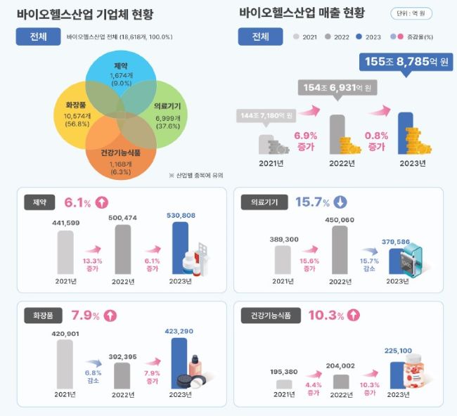 By sector, pharmaceuticals remained the largest component, generating 53.08 trillion won in sales in 2023, a 6.1% increase year-on-year. Cosmetics rebounded with a 7.9% rise to 42.33 trillion won after a decline in 2022. However, the medical devices sector recorded a sharp 15.7% drop, falling to 37.96 trillion won.