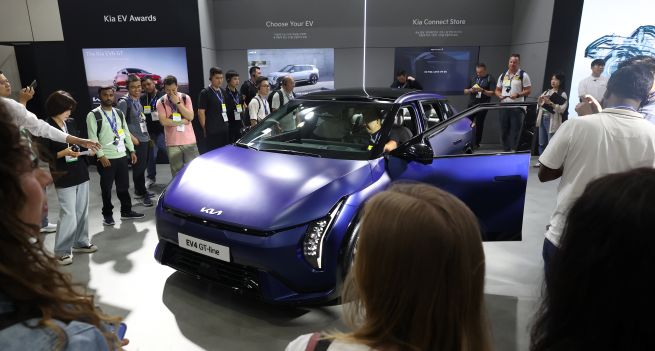 Foreign visitors listen to a presentation at Kia’s booth during the “EV Trend Korea 2025″ electric vehicle innovation exhibition held at COEX in Seoul’s Gangnam District on the 3rd of last month. (Yonhap)