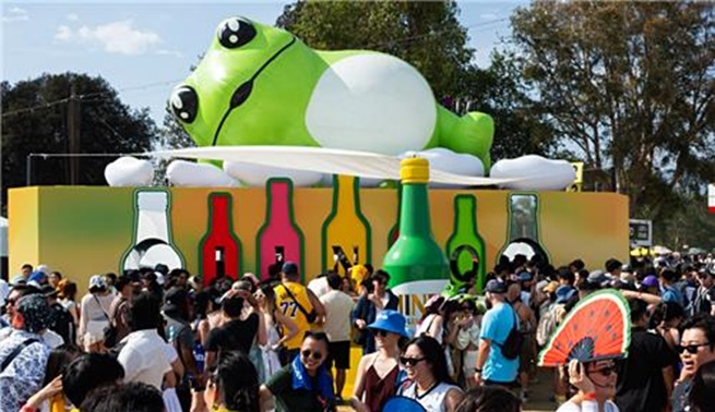 This undated file photo provided by Hitejinro Co. shows the “Jinro Bar” showcasing a variety of soju products during the Head In The Clouds (HITC) 2025 music festival, held from May 31 to June 1 in Los Angeles. The festival, which highlights Asian artists and culture, is a global event hosted in major cities, including LA. (Yonhap)