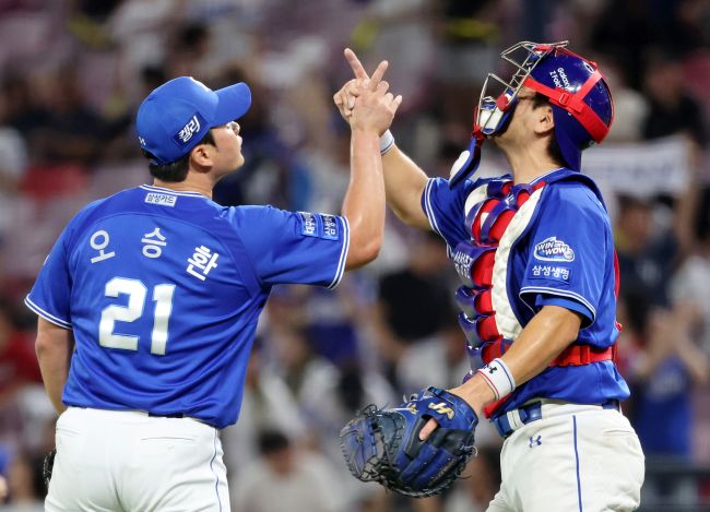 Samsung Lions closer Oh Seung-hwan (L) and catcher Kang Min-ho celebrate their team’s 5-4 win over the Kia Tigers during a Korea Baseball Organization regular-season game at Gwangju-Kia Champions Field in Gwangju, 270 kilometers south of Seoul. (Image courtesy of Yonhap)