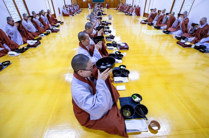 A scene of balwoo gongyang, a traditional monastic meal. Balwoo gongyang refers to a mindful eating practice at Buddhist temples using a set of wooden bowls called balwoo. This tradition traces back over 2,500 years to the practices of the historical Buddha and embodies values of gratitude and diligence. The food served in the balwoo is not meant for indulgence or fullness, but rather to sustain the body for continued spiritual practice.