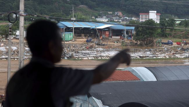 A local farmer surveys the wreckage of a strawberry greenhouse in the village, destroyed by recent torrential rains. (Image courtesy of Yonhap)