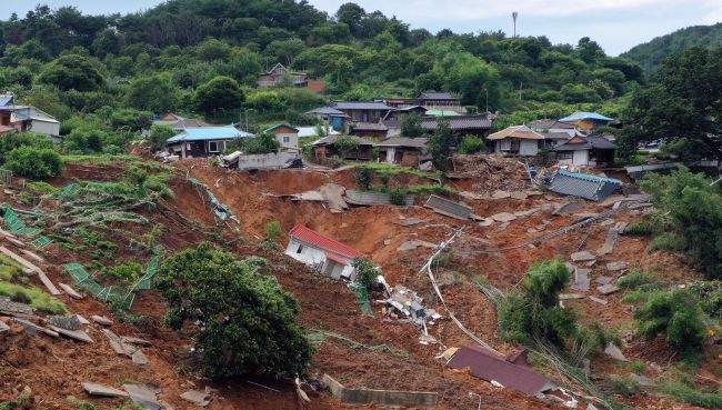 The village lies buried in the aftermath of recent heavy rain and landslides. (Image courtesy of Yonhap)