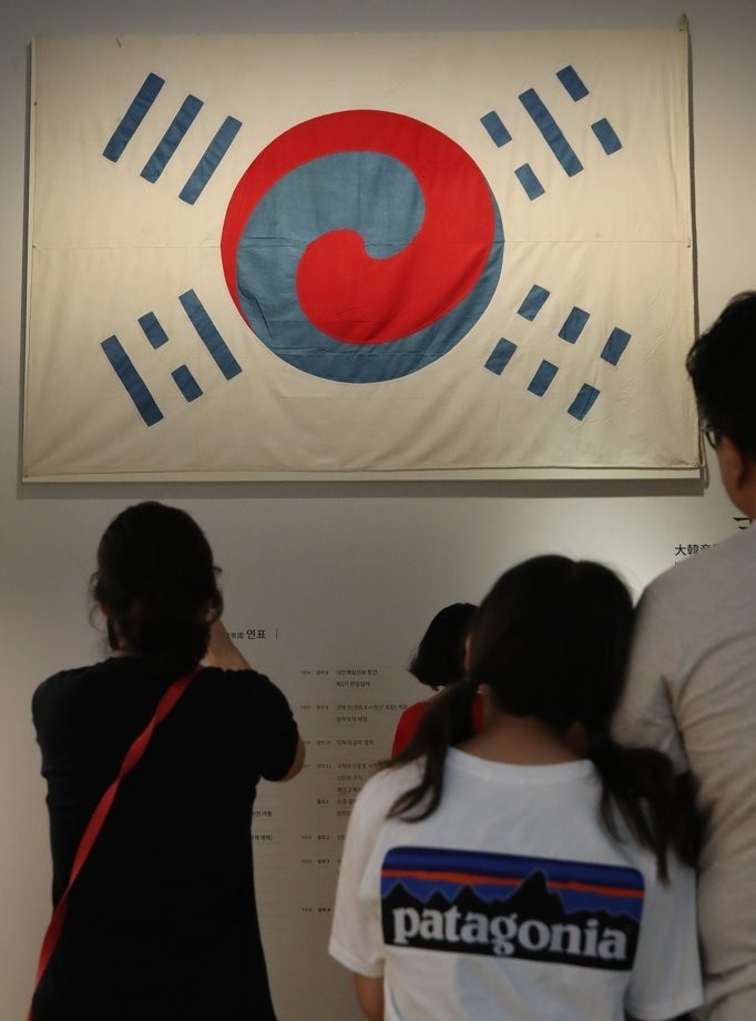 Visitors at the National Museum of Korea in Yongsan District, Seoul, view the Denny Taegeukgi, the oldest surviving Korean national flag. (Yonhap)