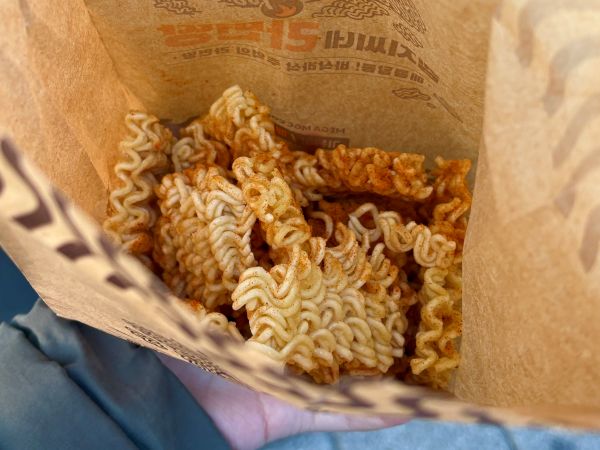 The snack, ramyeon-ttang — a microwaved, sweet-and-savory fried noodle dish priced at 1,900 won — has become a breakout winter item at a major coffee franchise, drawing long lines and rave online reviews for its flavor and value. Customers can choose spice levels, and many describe the freshly crisped noodles as “addictive.”