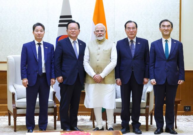 A team of special envoys led by former Prime Minister Kim Boo-kyum visited New Delhi and paid a courtesy call on Modi on Thursday.