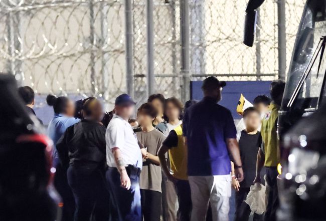 Detained workers from the Hyundai–LG battery plant construction site depart the ICE facility in Folkston, Georgia, en route to Atlanta Airport on September 11. (Image courtesy of Yonhap)