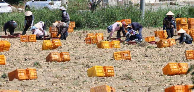 Foreign workers wearing traditional Vietnamese conical hats harvest potatoes (Yonhap)