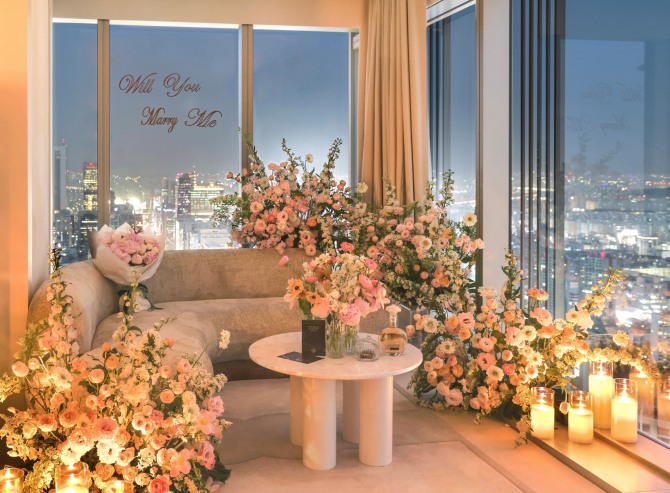 As the trend of luxury proposals gains attention, the hotel industry is rolling out a variety of tailored package deals. The photo shows the 'Long & Lasting Love' package offered by Signiel Seoul, a hotel operated by Lotte Hotel. (Photo courtesy of Lotte Hotel)