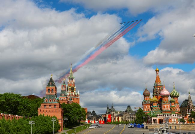 Airplanes fly in formation over Red Square in Moscow on May 5, 2025, during a rehearsal for the Victor Day military parade, in this Xinhua photo. (Yonhap)