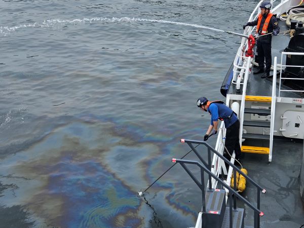 Officials conduct containment operations following an oil spill from a naval warship in waters off the southeastern port city of Jinhae on May 11, 2025, in this photo provided by the Coast Guard. (Yonhap)
