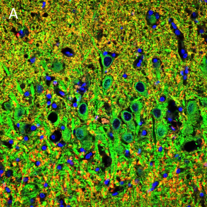 Same brain area in an aged untreated dog. There are no new neurons (no green cells), a few red dots (old synapses), but no new synapses (no yellow dots).