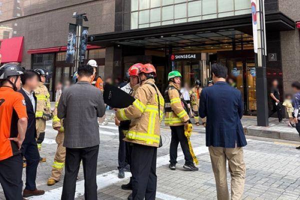 This photo, provided by a reader on Aug. 5, 2025, shows fire officials dispatched to Shinsegae Department Store in central Seoul due to a bomb threat. (Yonhap)