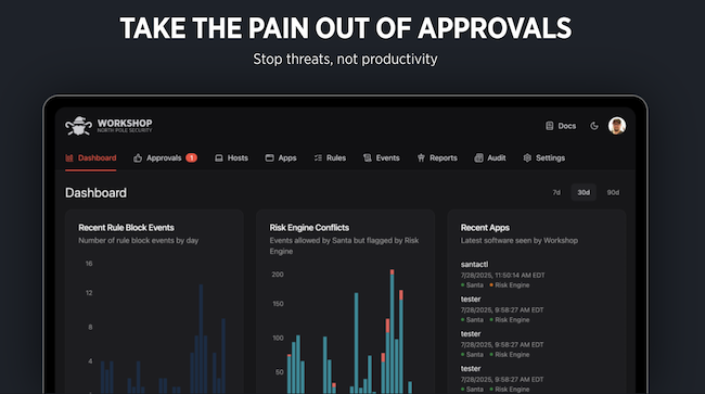 The platform is built on Santa, the widely adopted open source binary and file access authorization tool pioneered at Google by the founders of North Pole Security, who now maintain the project. While allowlisting is widely acknowledged as the gold standard in endpoint defense, it has traditionally been seen as too rigid for broad enterprise deployment. Workshop changes that by allowing teams to deploy allowlisting at scale without breaking workflows or risking outages. Workshop delivers the following benefits to customers in a single, performant platform: