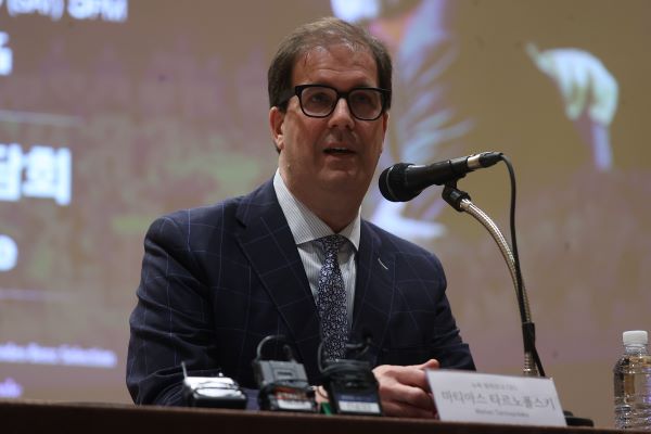 Matias Tarnopolsky, president and CEO of the New York Philharmonic, speaks during a press conference for the upcoming concerts by the New York Philharmonic in Seoul on June 25, 2025. (Image courtesy of Yonhap)